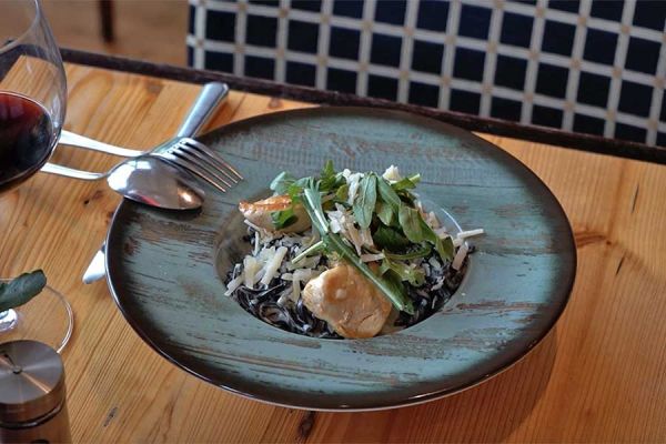 gegrillt auf getrüffelten Linguini, mit Rucola, getrockneten Tomaten, Pinienkernen, Parmesan